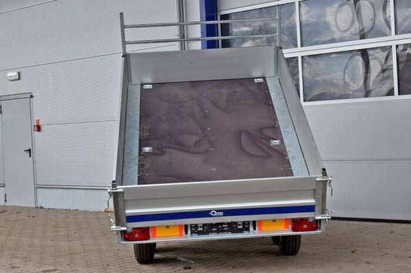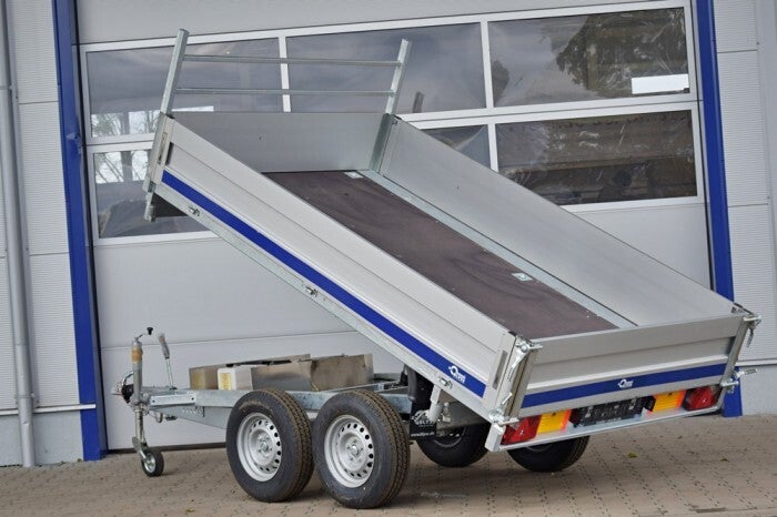 Der dreiseitige Kippanhänger ist mit einer elektrischen Pumpe ausgestattet, wodurch das Entladen der gelieferten Ladung schnell und bequem erfolgt. Anhänger auf Basis eines massiven feuerverzinkten Stahlrahmens. Dank der großen Tragfähigkeit - mit einem zulässigen Gesamtgewicht von 3.500 kg - können Sie eine große Ladungsmenge sicher transportieren und dreiseitig fahren - rückwärts und seitwärts, Es wird sich nicht nur auf der Baustelle als bequeme Lösung erweisen. Der Anhänger ist mit Aluminium, zu öffnenden Seiten, einem wasserdichten Boden aus Multiplex-Platte, einer Leiter an der Vorderseite und Griffen zur Befestigung von im Boden platzierten Waren ausgestattet. Es besteht die Möglichkeit, den Anhänger mit einer Verlängerung mit Plane nachzurüsten.